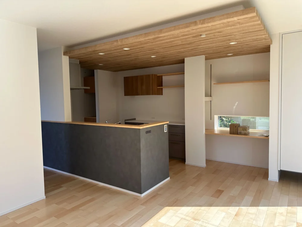 キッチンの下がり天井は木目のクロスを採用し、LDKのアクセントになっています💡