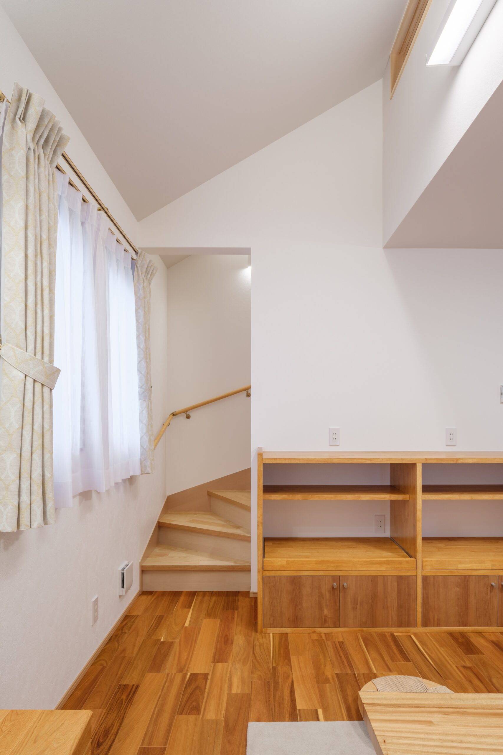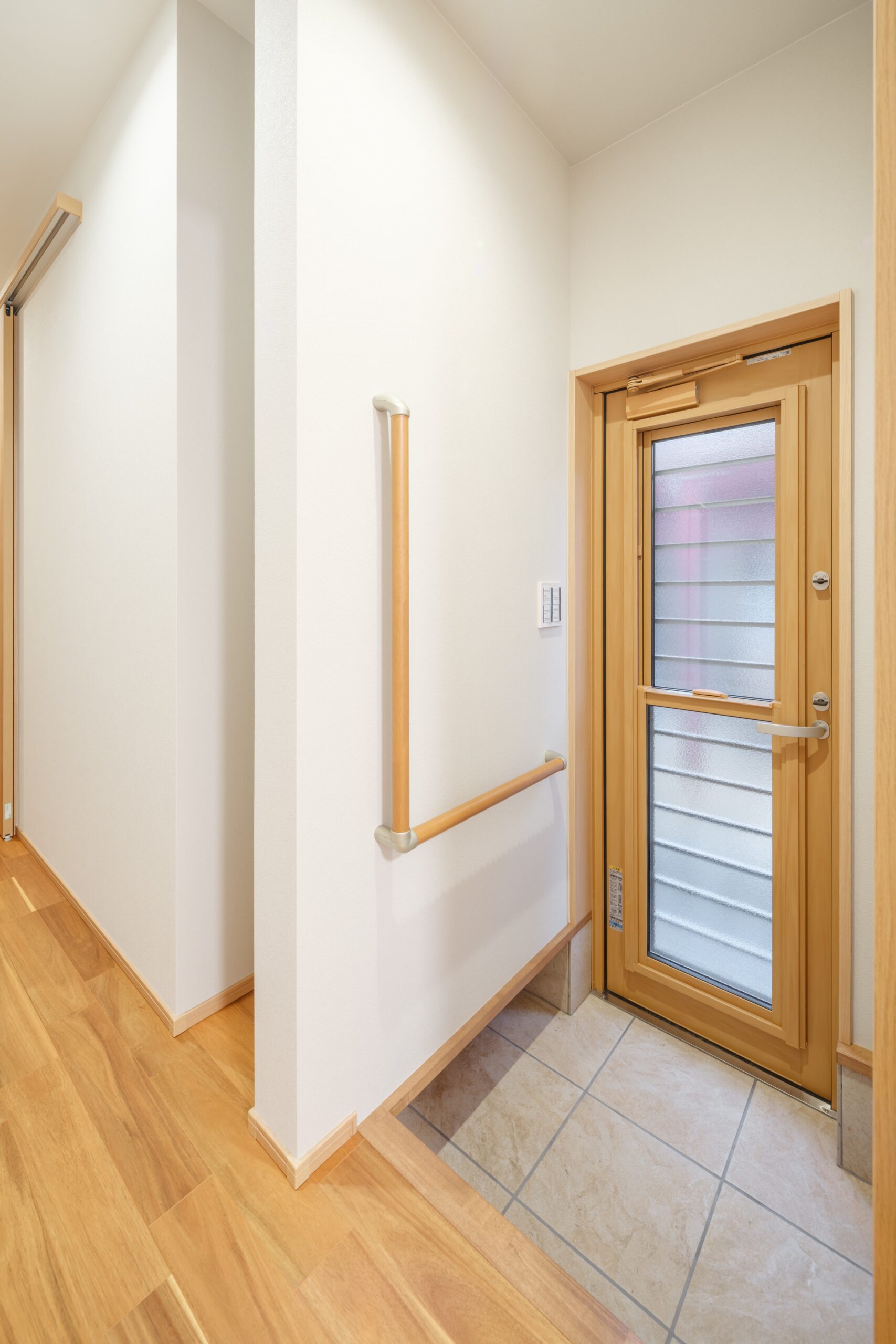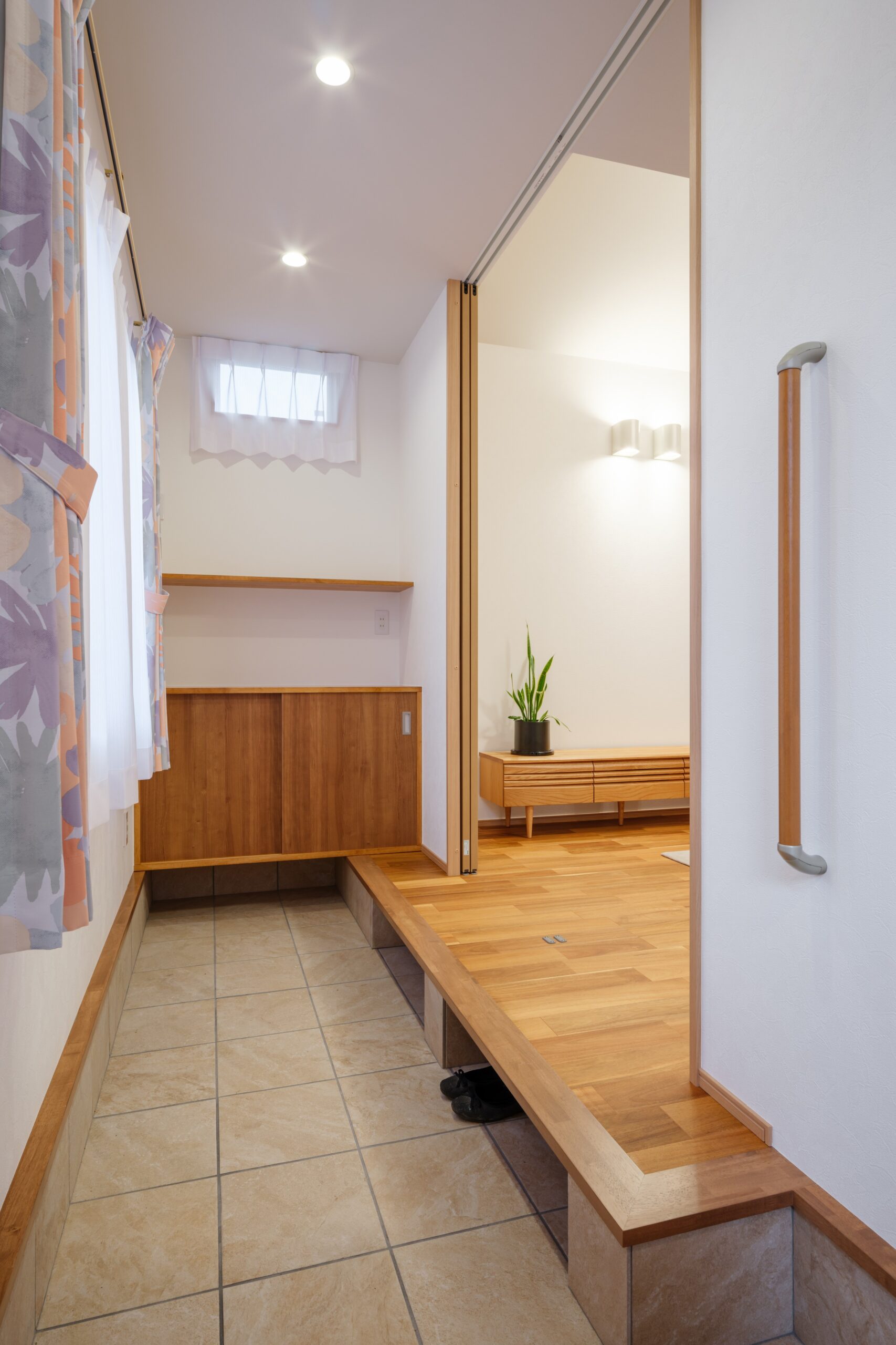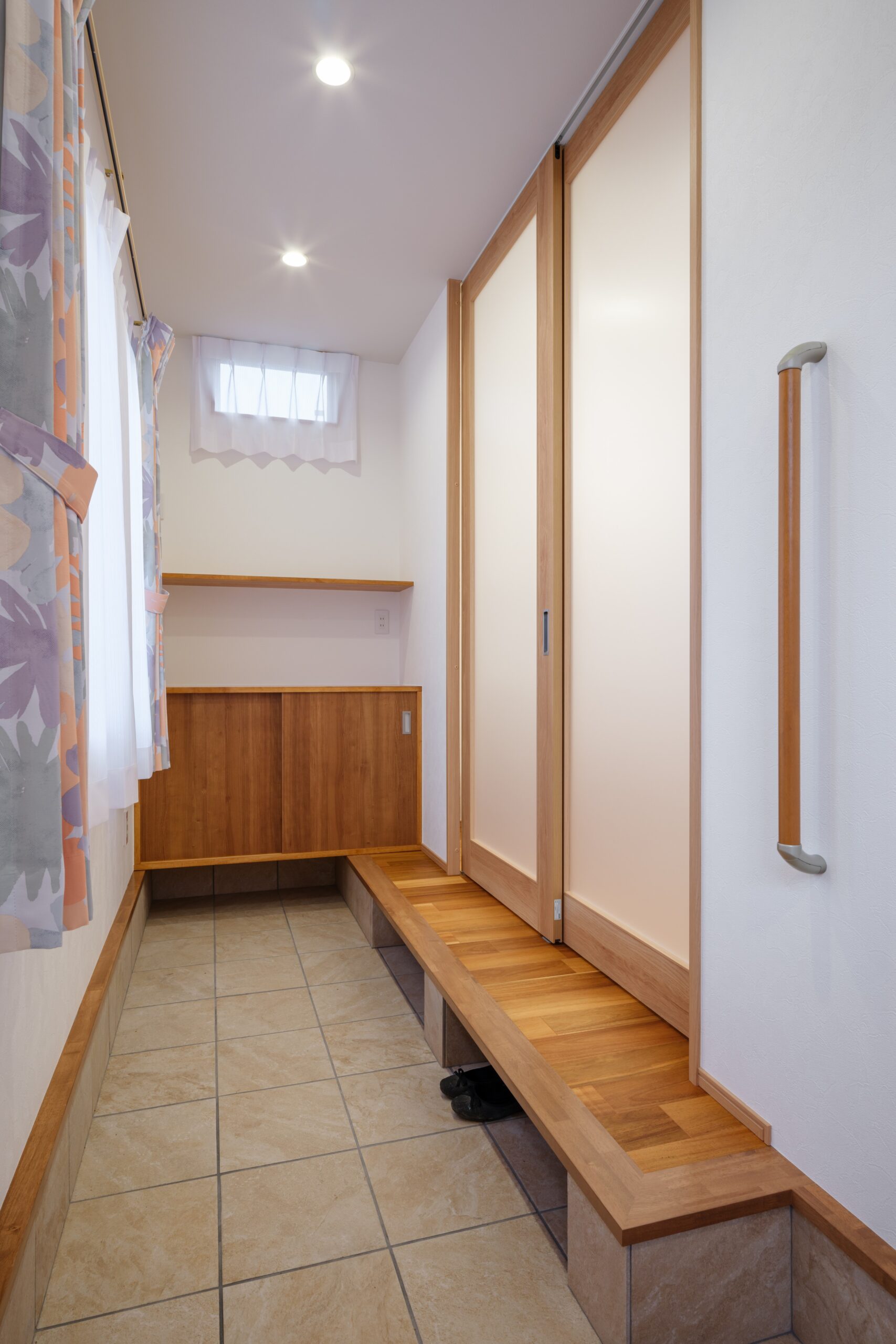 玄関はゆとりをもたせ、腰かけて靴の脱ぎ履きができるよう幅を広く取りました。腰掛けの下には靴を収納できるスペースをつくり、いつもすっきりとした玄関に。
